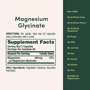 - 240 mg Magnesium Glycinate Per Two (2) Capsule Serving