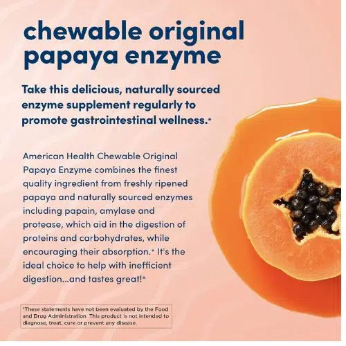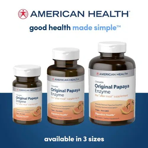 American Health Original Papaya Digestive Enzyme (250 Tablets) is a chewable digestive aid made with the finest quality papaya fruit. These natural, delicious tablets are rich in papain—a powerful enzyme that helps support healthy digestion and nutrient absorption.
