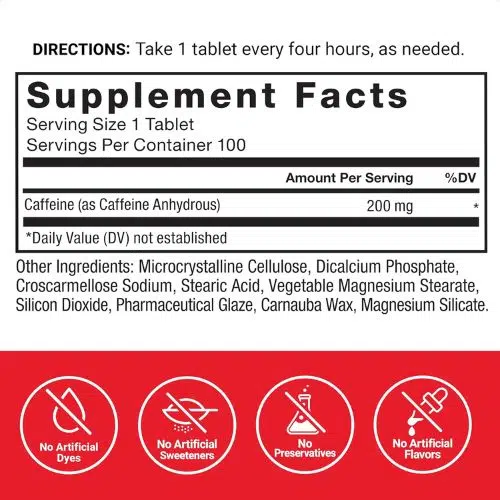 200 mg of pure caffeine per tablet — equivalent to about two cups of coffee