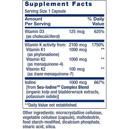 Life Extension, Vitamins D and K with Sea-Iodine (60 Capsules) is a scientifically formulated supplement that combines three essential nutrients—Vitamin D3, Vitamin K (K1 & K2), and Sea-Iodine—to deliver comprehensive health benefits. This powerful trio helps promote strong bones, support arterial and cardiovascular health, and maintain healthy thyroid function.
