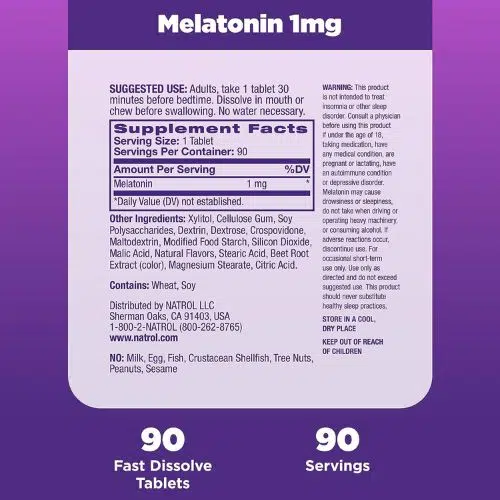 Natrol’s high-quality melatonin tablets are 100% vegetarian and free from artificial colors, flavors, and preservatives. Whether you’re dealing with occasional sleeplessness, jet lag, or simply want to improve your sleep quality, Natrol Melatonin 1mg helps you fall asleep faster and wake up feeling refreshed—without morning grogginess.