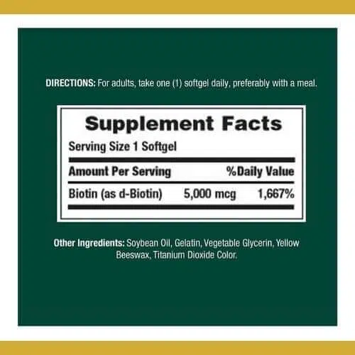 Nature’s Bounty Biotin 5,000 mcg (72 Softgels) is a powerful supplement specially formulated to support the health of your hair, skin, and nails, while also promoting energy metabolism. With 5,000 mcg of high-potency Biotin per serving, this supplement helps maintain your natural beauty from within.