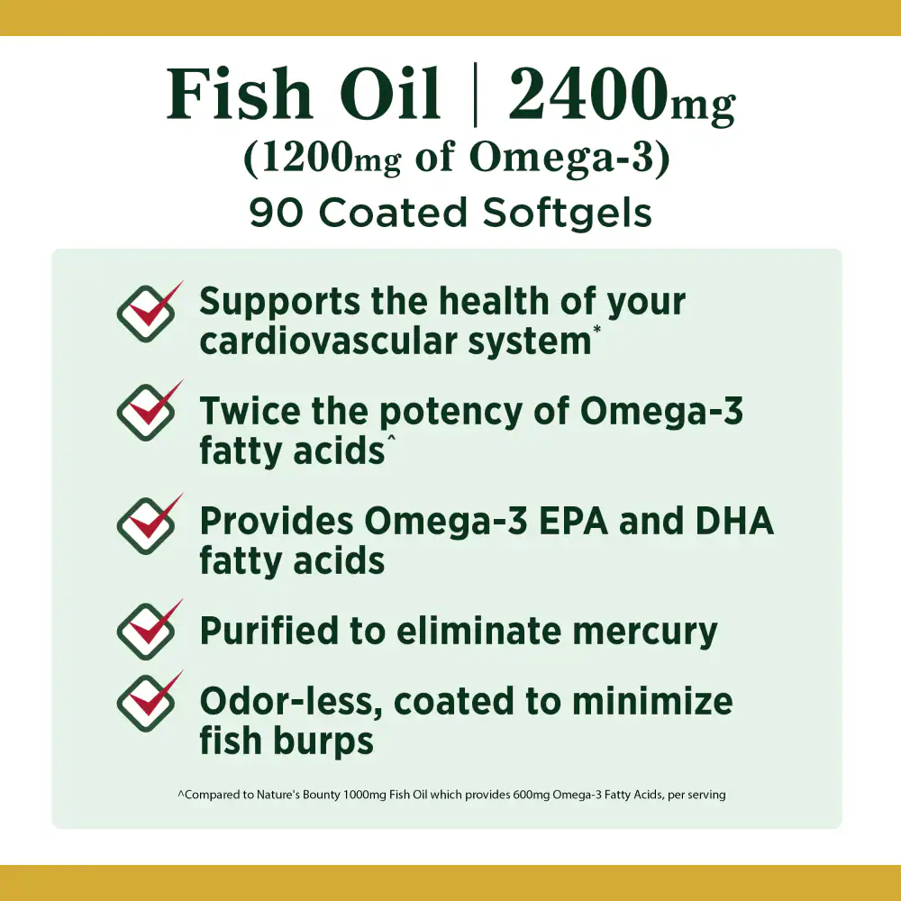- Nature’s Bounty Fish Oil Omega-3 600mg, Double Strength, 2400mg Fish Oil