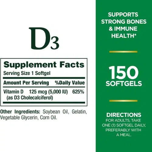 Whether you want to support your bone health, boost your mood, or strengthen your immune defense, Nature’s Bounty Vitamin D3 (125mcg) 5000 IU -150 Softgels is an excellent addition to your daily wellness routine.