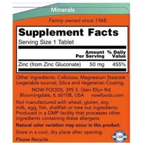 Each tablet delivers 50 mg of elemental zinc from zinc gluconate—ensuring effective absorption and results. Manufactured by NOW Foods, a trusted name in natural health, this supplement is free from GMOs, gluten, dairy, and artificial additives.