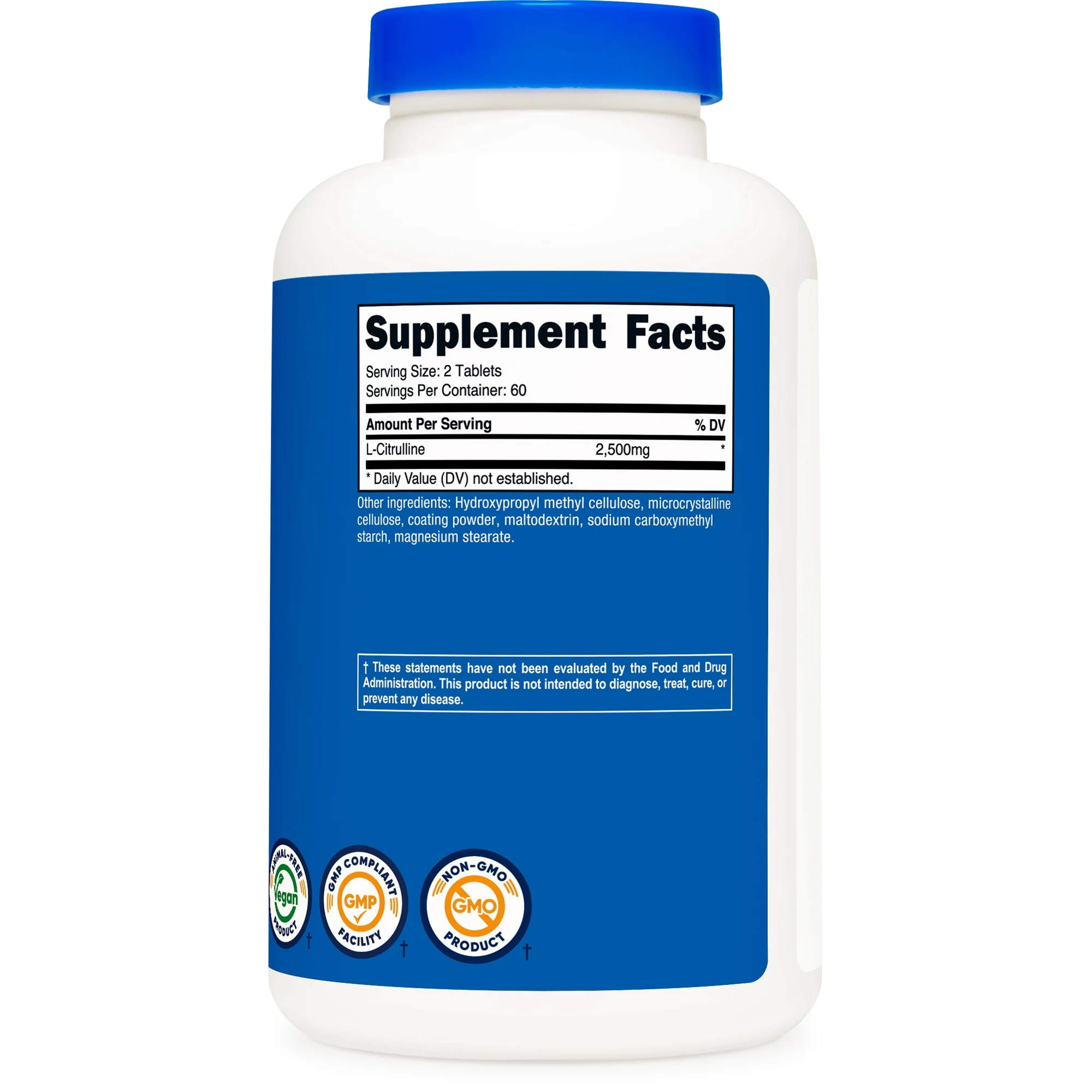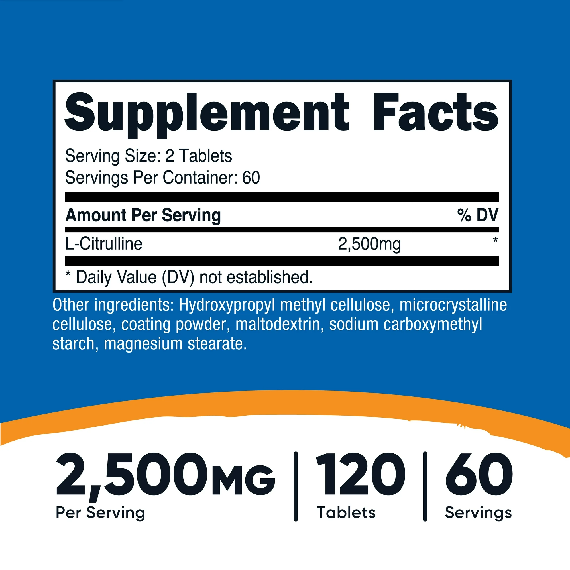 • Nutricost L-Citrulline tablets contain 2.5 grams (2500mg) of L-Citrulline in every serving.
